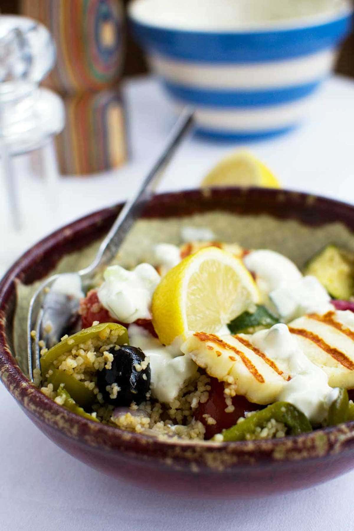 I baked the halloumi in the oven while couscous and veges finished, then a quick burst at a higher temperature. Slacked off and used supermarket French dressing but it worked.