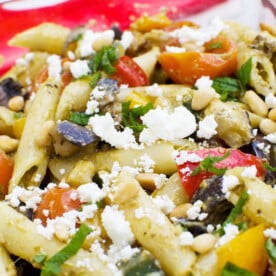 Loaded with colorful roasted veggies, tossed in a creamy pesto dressing and sprinkled with tangy feta cheese, this is just as tasty cold from the fridge as it is warm from the pan. Perfect for making ahead!